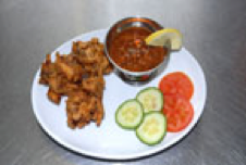 Pakora with side salad A great lunch or snack portion, but remember that most pakora are deep-fried and contain a lot of oil. |