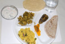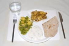 Portion control: vegetarian selection A healthy vegetarian lunch selection. A good lunch-size portion, but remember that some chutneys and pickles contain a lot of salt and oil. |